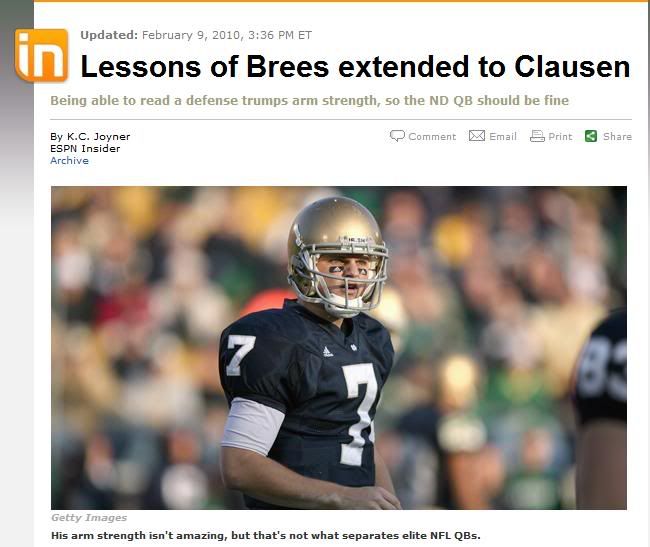 I think this guy has the wrong idea about arm strenghth. I dont think the issue with arm strength stems from the ability to throw the deep ball, but the ability to give the defender less time to recover. The faster you get it to the reciever, the larger your window to complete the ball to the wr is because the closing time is less, which results in a higher completion percentage and less picks. And before someone jumps on me, I just want to cover my a$$ by saying that arm strength isnt the end all be all or THAT major a factor, but you do need to be able to throw it hard enough to hit your man for the split second that he is open. Weather Clausen can throw it hard enough?I dont know, Im not a scout.