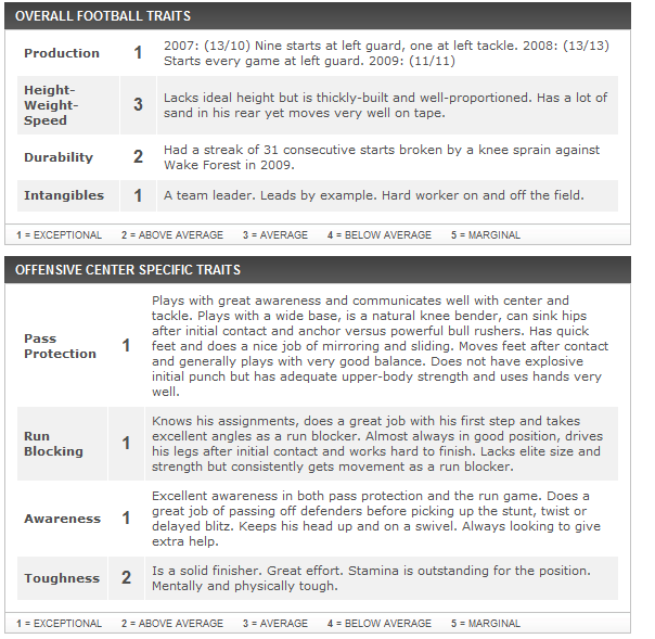 My school didn't have very much by way of pro prospects on it's football team this year, but our left tackle should be a nice converted RG or RT at the next level. Not dissimilar to Chris Kuper, who played at the same level five years ago.