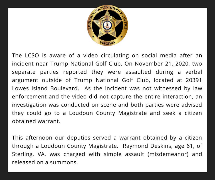 https://www.fox5dc.com/news/loudoun-...rump-supporter WashingtonUPDATE (4:55 P.M.): Loudoun County sheriffs say they charged the man in this video after a citizen obtained a warrant through a local magistrate. 61-year-old Raymond Deskins of Sterling faces a misdemeanor simple assault charge after the recorded confrontation that's going viral on social media.