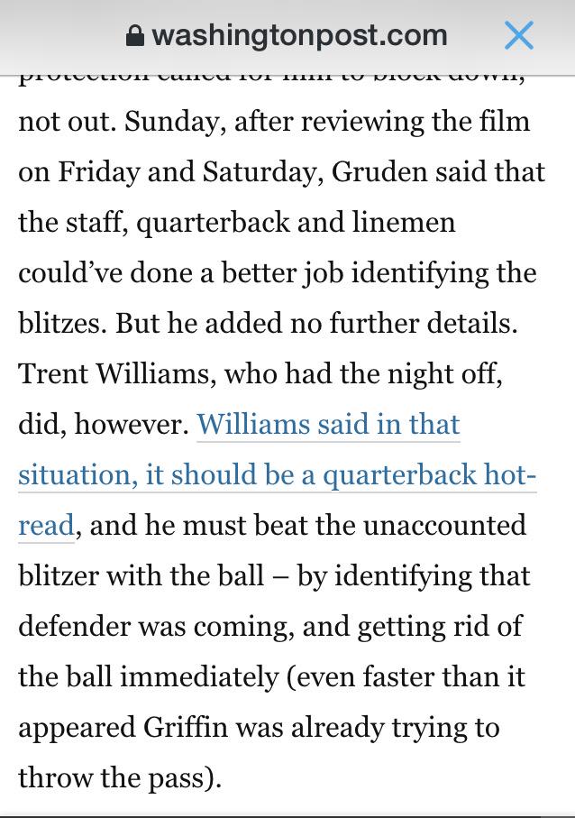 "One thought from the multiple NFL people I communicated with over the weekend (scouts, executives, former executives and players) was unanimous: Quarterbacks do not improve their pocket presence and you can't win if they don't have any. And when you’re in your fourth training camp and still struggle in this area? Not good. It’s not going to change and if we’re seeing it – or other football people around the league are seeing it -- you can bank on it that the Redskins see it as well." "The Redskins were genuinely encouraged by some early signs -- I saw and heard the positives. But it can be difficult to get a good read on pocket presence in practice. You’re in shorts and the rushers pull up. In games, it’s a different speed and flaws are magnified."