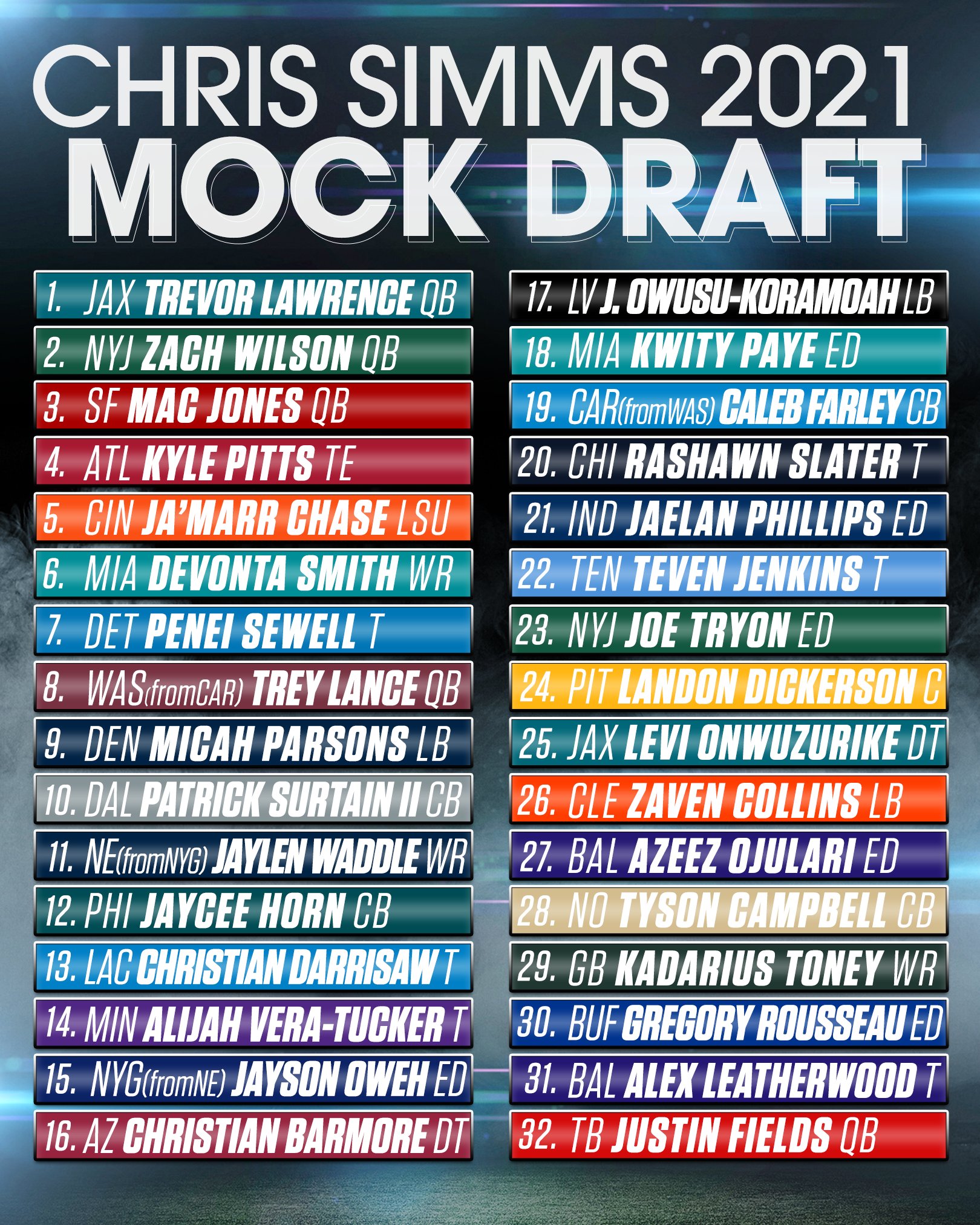 I still believe we will target LB or Oline, whichever player with the highest grade on the board will be drafted. Although I'm still sticking with LB because I think all best Olines players will be gone by the time we pick so my guess it will be Jamin Davis or Zaven Collins. |