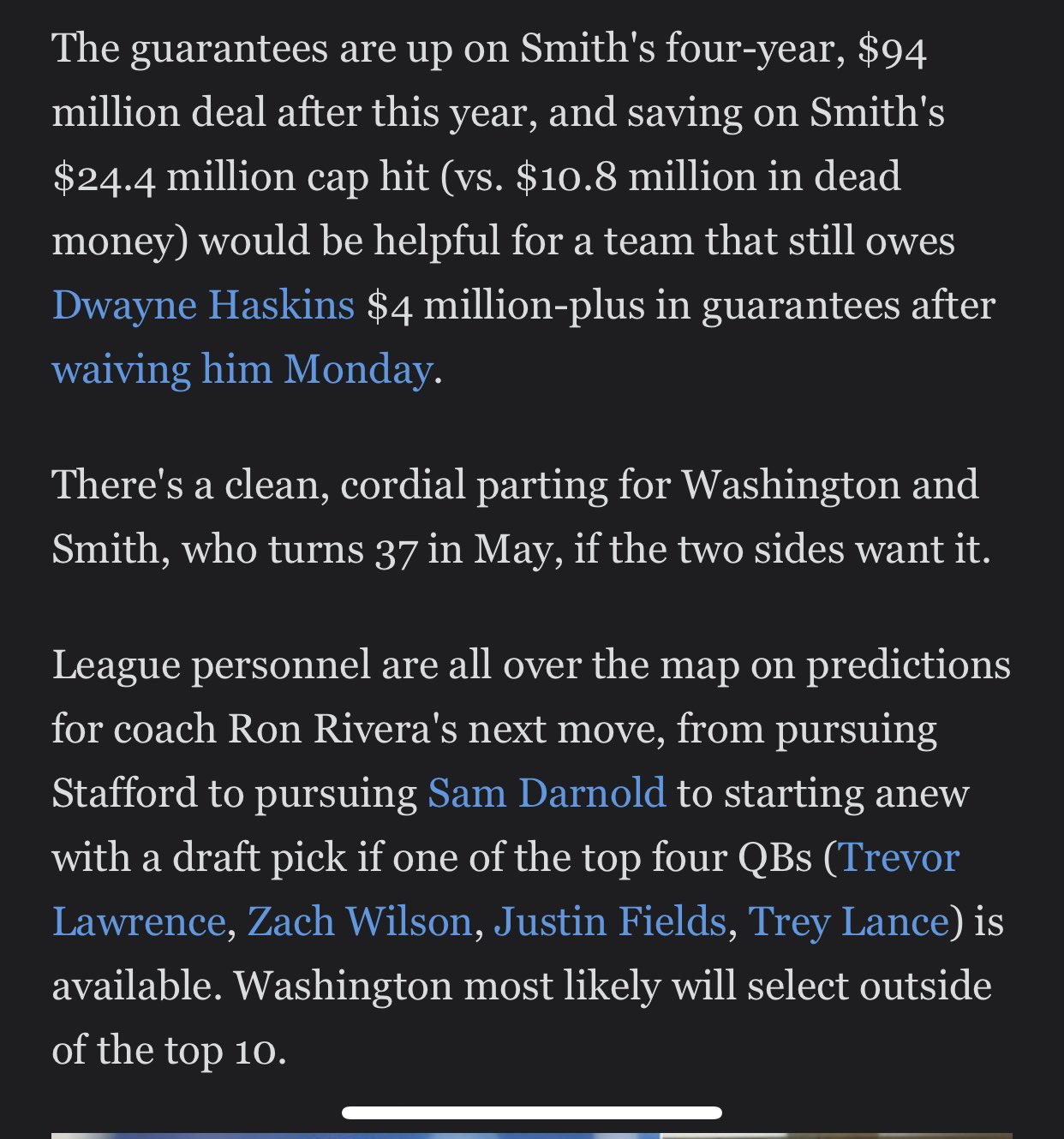 Bottom line for me - don't trade any D-linemen, keep all the draft picks (unless there's a chance to maneuver a little to get your future QB in the draft), start to extend some contracts for guys that will be the core of this team moving forward, upgrade the QB, Oline, WR, TE, and LB positions via free agency, bring back Heinicke, draft your future QB then BPA in the draft, and win the SB. |