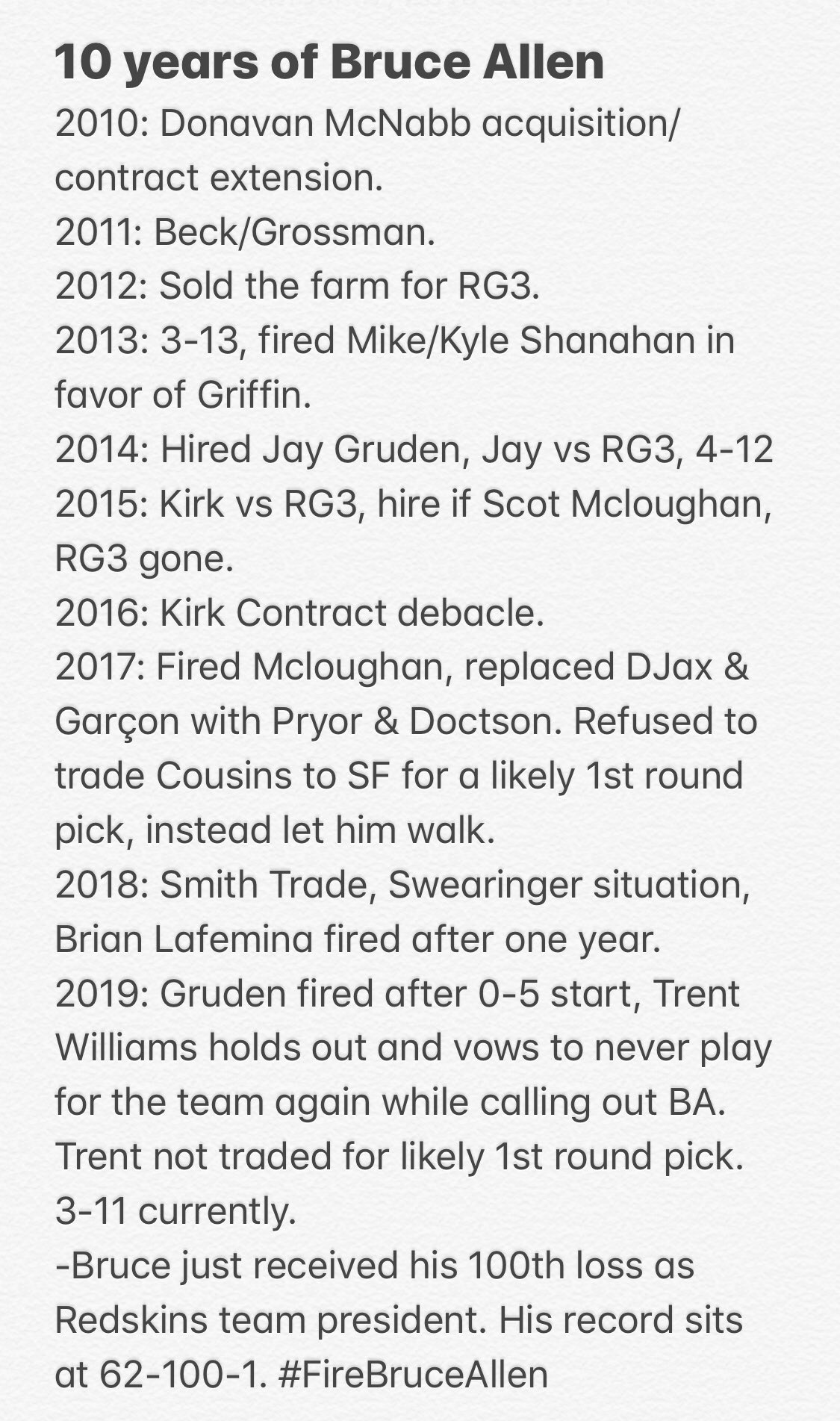 My wishful thinking is that Snyder is pressuring BA to resign, as opposed to firing him. I believe VC was offered a lower position to stay with the team and he resigned.