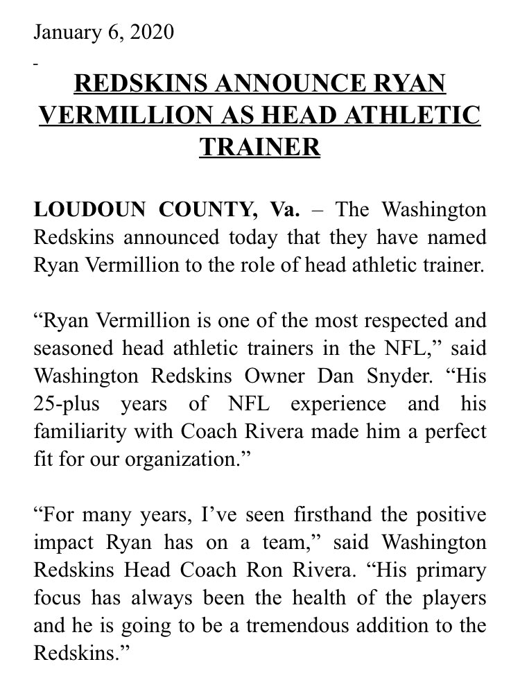 HC Ron Rivera DC Jack Del Rio DL Sam Mills III LB Steve Russ DB Chris Harris (LA Chargers asst db coach) ST kept current staff OC ? OL. John Masko (Carolina same position) WR jim Hostlet (Carolina same) Head Trainer Ryan Vermillion All of these are from public reports. Only Jack Del Rio and Ryan Vermillion had public press releases that I know of. Sent from my SM-G973U using Tapatalk Last edited by CRedskinsRule; 01-06-2020 at 10:41 PM. |