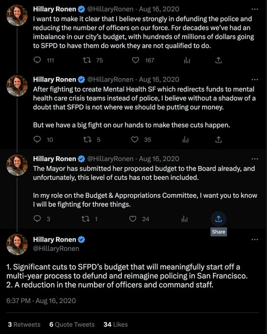 Hilary Ronen now emotional and begging for more police in her district because of violent crime: https://twitter.com/lwoodhouse/statu...00014552981507 Now she claiming she is somehow a victim….unfortunately she is a gaslighted progressive liar. If you want or ever wanted to defund the police, enjoy you that bed you made and face the fact there is blood directly on your hands.