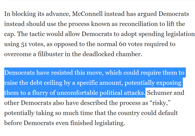 Really? Read your own article. Or my previous post. Because you and the rest of the right will turn around and call them reckless- it would be political suicide. This is an instance where there needs to be bipartisanship. Like there was when Trump kept doing it. The crazy thing is he is the reason we need to do it now. And suddenly Mitch is hiding in the bushes. I know you see what is going on here Chico. |