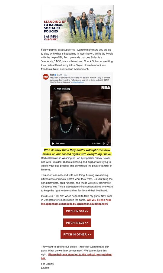 ^^ lol pretty much every Fox news trigger word in there, patriots, socialists, radical left, liberals, AOC, media, Pelosi... and of course they're coming for our gunz please help send $$