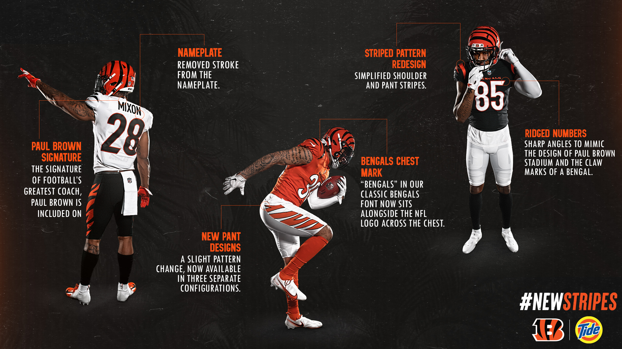 Bengals new uniforms...big upgrade over the mess they've been wearing with random piing and mismatched stripes and panels. Much cleaner look. Less is more.